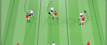 20×30メートルの4つの格子型を作る。どのゾーンにも、2人のオフェンス(ボールを持って)と、ボール保持者へ軽くプレッシャーをかける2人ディフェンス(赤色)を配置する
