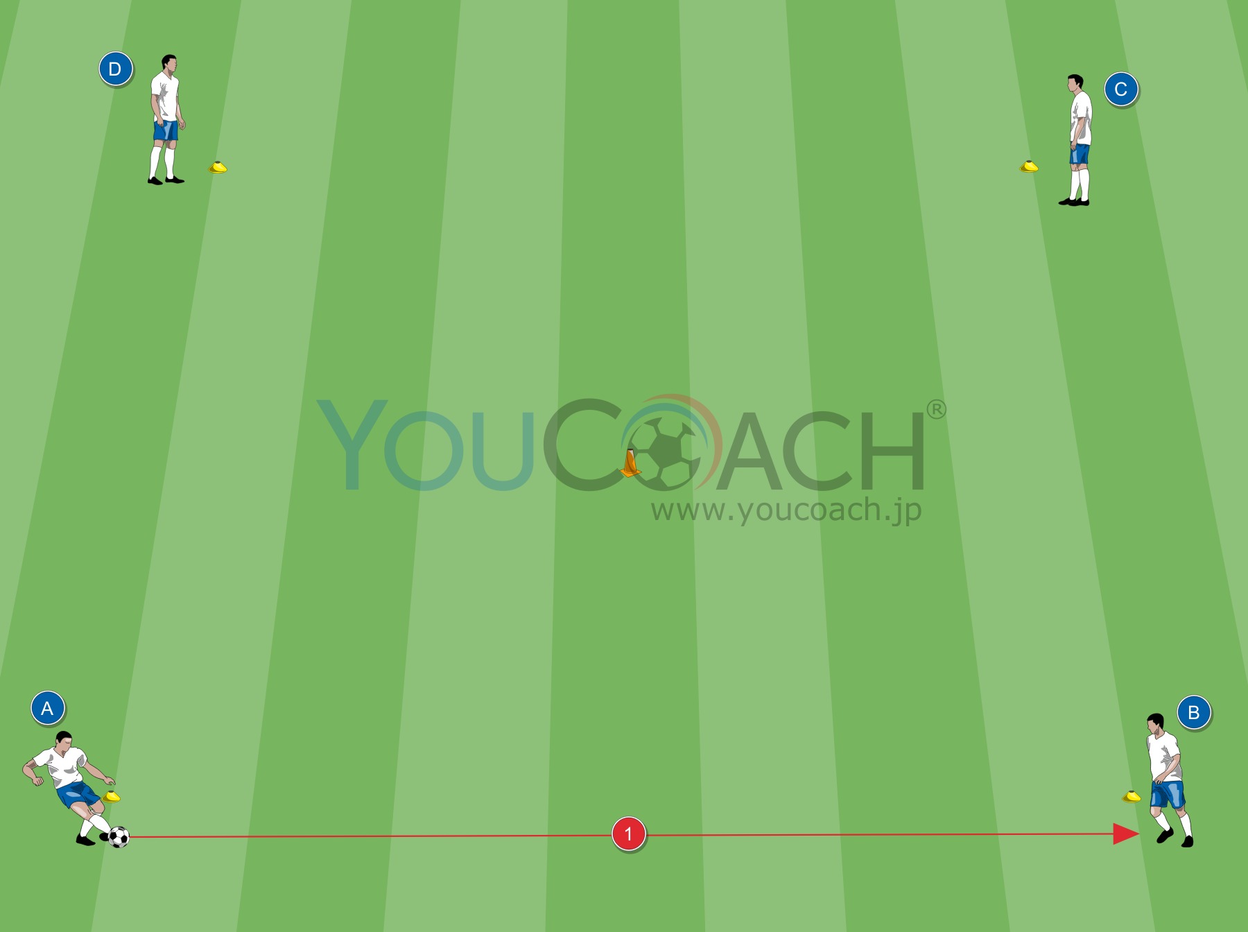 図 2: BはCにパスをしその間にAはコーンを周ってダッシュ