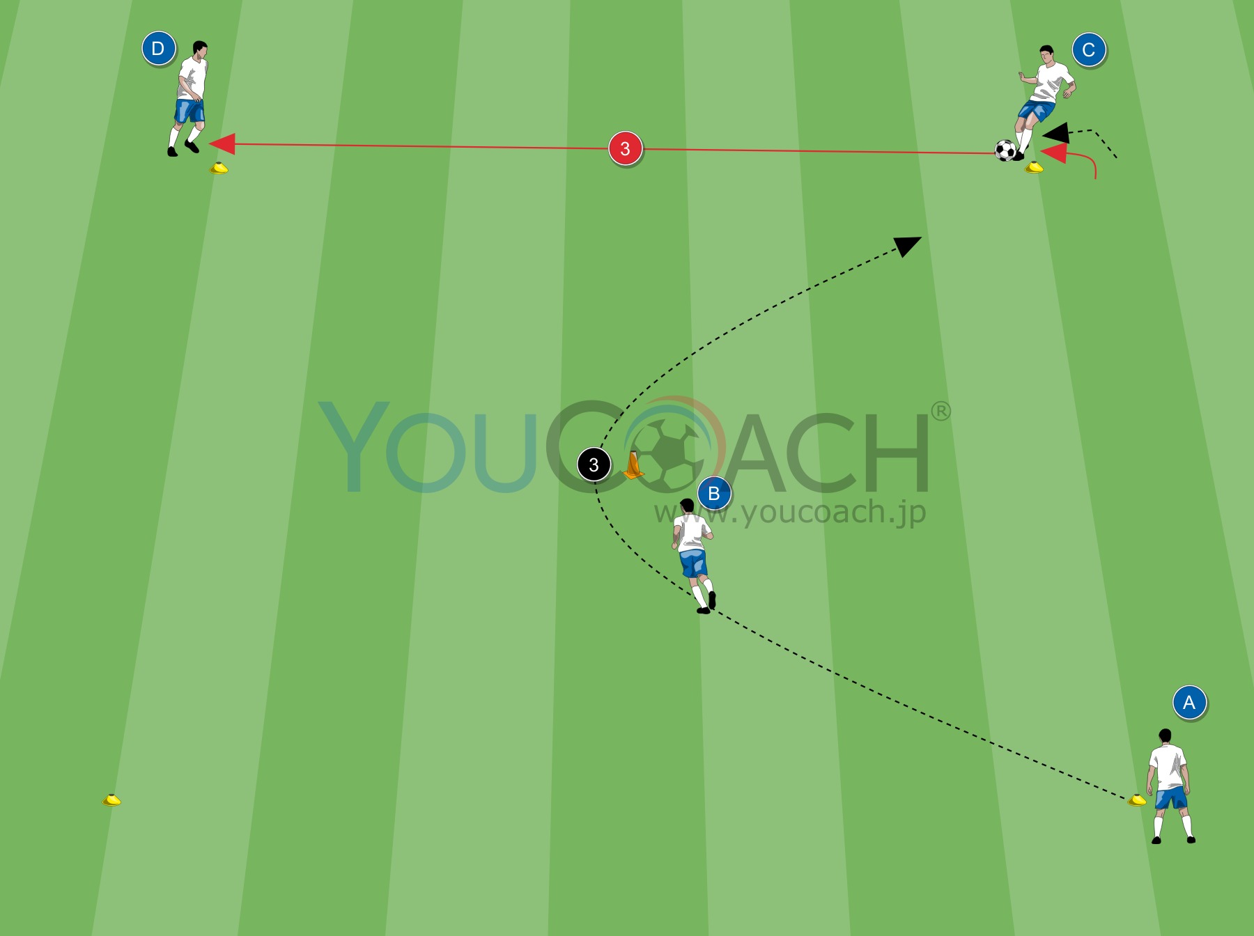 図3: CはBがコーンにダッシュしてる間にパス。