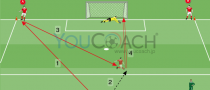 マーカー4つ使って15 mの四角を作る。各角の前にポール2つをクロスさせて配置して相手に見立てる。真ん中の四角にはポールを一つ設置する。9選手を各角に配置する。(一つの角から3人スタート).
