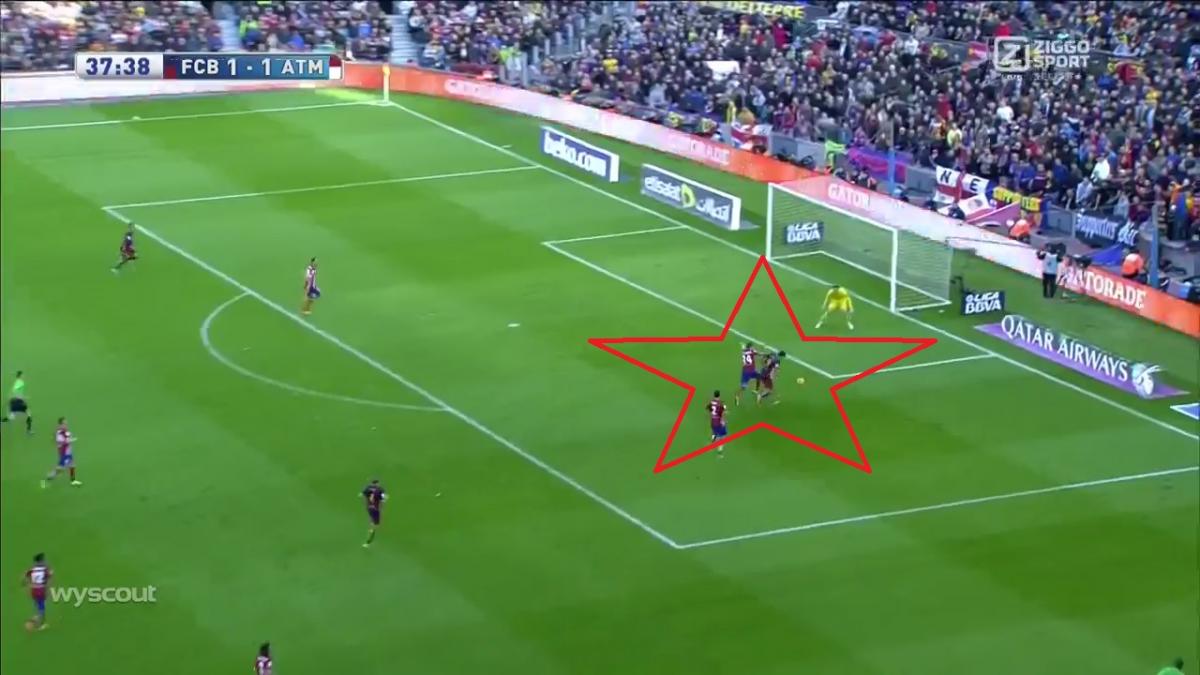 ボールはダニエウ・アウベスへ。タイミングをうかがう。スアレスがDFの裏へ走り出す。アトレティコディフェンダーとの競り合いがここから始める。