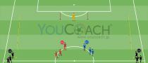 戦術面(スペース利用してプレーに変化をつける、マークを外す動き)、技術面(シュート、クロス、パス、ヘディング)両方を伸ばす4ゾーンのポゼッショントレーニングです |