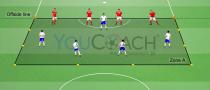 ハーフピッチの中央には各辺7mのミニスクエアをポール4本で作ります。そしてミニスクエアの外には27×10mの台形(ゾーン1、ゾーン2、ゾーン3、ゾーン4)をマーカーで作っていきます。 2チーム(1チームあたり7名)に分けてGK1名入れたら準備完了。
