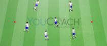 ・フラフープを回ったら反対側で待つ味方にパス、 パスを受けたプレーヤーは反対側から同じ内容をこなします。