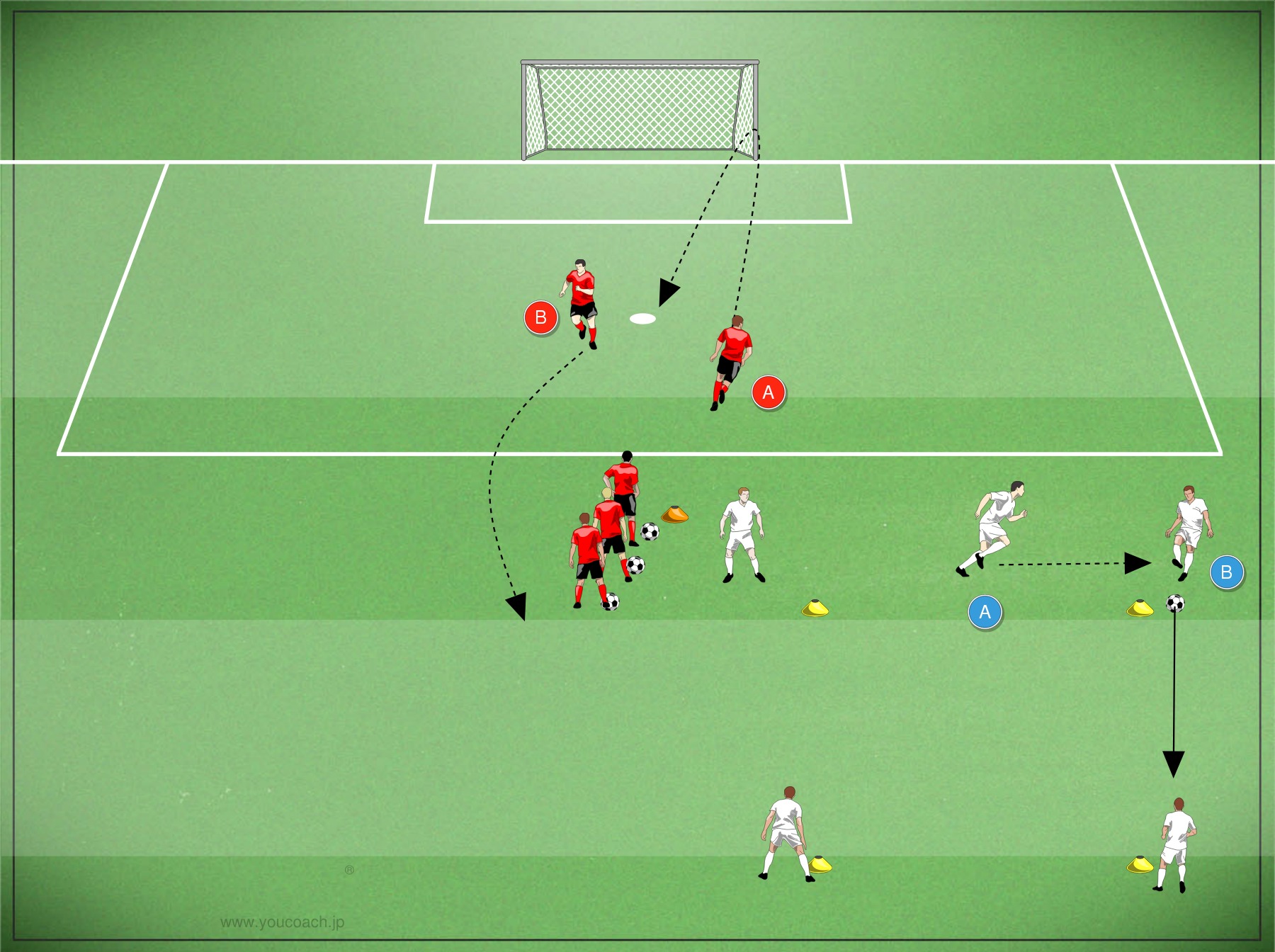 スタートの合図で、赤チームはプレーヤーAはプレーヤーBにパス。そのボールをもう一度プレーヤーAにリターンパス。プレーヤーAはこのボールをゴールにシュートする。シュートした後、次のプレーヤーをスタートさせるためにゴールのポストをタッチしなくてはいけない。ポストをタッチしたら、次のプレーヤーがスタート。