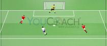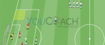 トレーニングに必要な広さは、60×40メートル。フィールドの左サイド、ゴールから25メートルの地点に2つのコーンを使い5メートル幅のゲートを1つ作る。4人1組で3グループにチーム分けをする。1つ目のグループは、ゲートの10メートル手前の位置にそれぞれボールを持って集まる。2つ目のグループは、ゲート反対側のペナルティエリア付近でゴールに肩を向けて立つ(図に示されたように)。3つ目のグループは、(図のように)ゴールの側面にビブスを着て立つ。ゴールキーパーは、ゴールを守る。