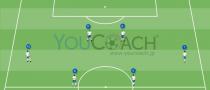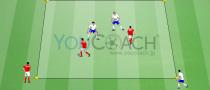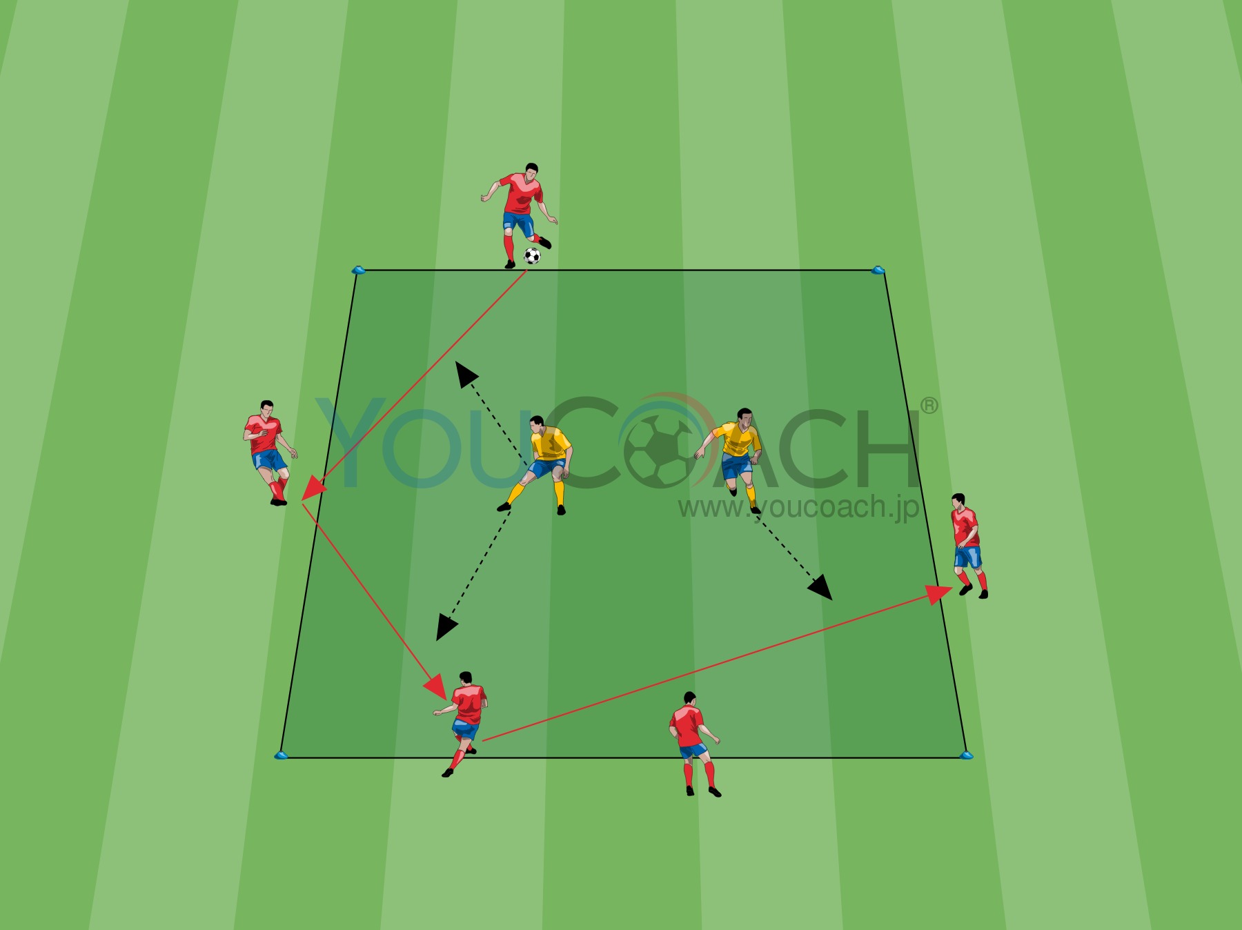 プレイヤー10×10メートルのコートを幅広く使います。ポゼッションチームは3つ辺にはプレイヤー1人ずつつき、残りの1つ辺には2人つく状況となります。コート内のプレイヤー2人はインターセプトを狙います。ポゼッションチームのプレイヤーは各自がいる辺のみしか動けない。もし、ディフェンスがインターセプトに成功した場合は、パスをカットされたプレイヤーと交代する。