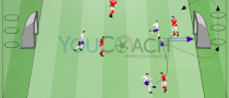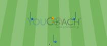 Viaで赤のプレーヤーは、自分の仲間に浮き玉のパスをする。2タッチ以内で、ボールをコントロールし、ゴールを狙う。もし、ゴールが決まったら、1ポイント。向かいの白のプレーヤーは、赤のプレーヤーにパスを出す。これをダイレクトでシュートを狙う。決めることができれば、さらに1ポイント。もし、最初のシュートが失敗した場合、白のプレーヤーは、素早くドリブルを始め、青のマーカーで作られたラインの突破を狙う。ライン突破できれば、1ポイント。その前に赤のプレーヤーが奪い、ゴールを決めることができれば、1ポイント獲得。