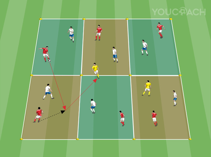 - 目的は、狭いスペースでの継続的なマーク外し動き直しと素早い判断によってポゼッションを維持し、味方へパスをつなぐことである。守備者に先んじて動くこと、スペースを読む能力、1対1でのドリブル突破、味方やフリーマンのサポートを待ちながらのボールキープ能力が非常に重要となる。
