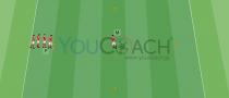 25×25mのスクエアをコーン4個で準備します。各辺には赤と青のゲート(2mの大きさ)を交互に配置していきます。各チーム攻撃するゲートの色(例えば赤チームは赤ゲート、白チームは青ゲート)を決め、対戦相手を決めたら準備完了。