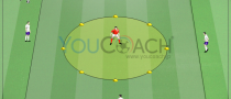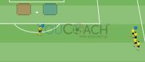 - Bはコントローロ・オリエンタート(方向付けのトラップ)の後、ディフェンス役のCと勝負開始。一方でAはパスした後にマーカーを通過してA1のポジションまでオーバーラップ。
