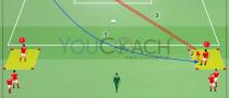 - 11番は仲間の7番へ壁パスをする。10番は幅広く対角のランを継続し、9番はペナルティーエリアの近くにゴールを狙うために移動する。