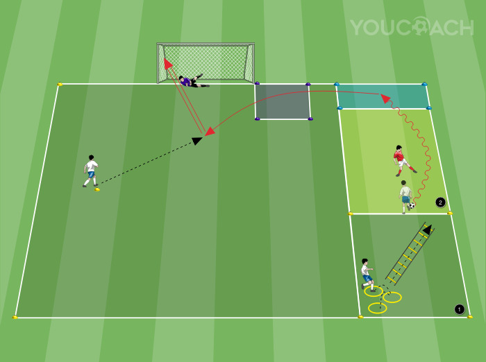 ゴール横に4つのマーカーでエリアを作成(図のPゾーン)。ペナルティエリアとサイドラインの間に、奥行き16メートル・幅12メートルの長方形を作成(ゾーン2)。この長方形内、ゴールライン付近に「クロスゾーン」を作成(図の青帯)。長方形に隣接してハーフウェイライン側に、12×12メートルの正方形を作り、3つのフープと1本のラダーを使ったコーディネーションコースを配置(図のゾーン1)。ペナルティエリア反対側のサイドにマーカーを設置し、攻撃側選手のスタート地点とする(図の白い選手)。これにより、スタート時の動きのある選手は3人:ゾーン1の白い攻撃者、ゾーン2の赤いディフェンダー、ゴール反対側マーカー横の白い攻撃者。各スタートポジションには待機中の選手を配置。各セット終了後、選手のスタートポジションをローテーション