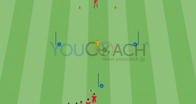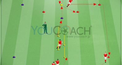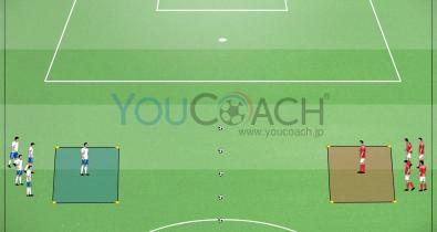 ピッチ中央のGKは前と後ろからシュートしてくる2チームの攻撃を防がなければならないため、タフなトレーニングになるでしょう。GKは背後に気を付けましょう。フィジカル