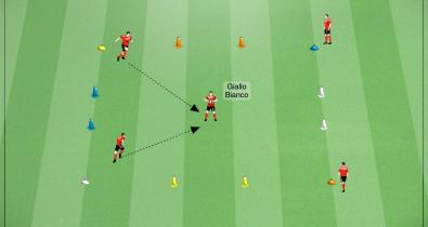 4色の異なるマーカーで正方形のグリッドを作成。それぞれの辺にゴールとなるコーンを設置。マーカーと同様に異なる色を使う。 4人のプレイヤーがグリッドの角に付き、5人目のプレイヤーがボールを手に持ち、グリッドの中央に立つ。 この中央のプレーヤーがスタートの合図を出す。 スタートの方法は、中央のプレイヤーがボールを上に投げ、グリッドを作成したマーカーの色に対応した2色を叫ぶ。...Coachpedia