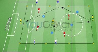 グアルディオラのバルセロナは、ポゼッションキープを上達させるため、また相手のプレッシャー下で素早くプレーを広げる動きをトレーニングするために、このボールポゼッショントレーニングを行っていました。戦術