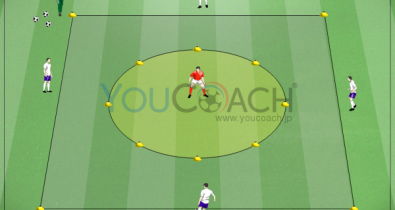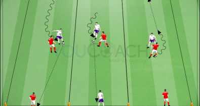 1対1の勝負を通じて、ドリブル、フィジカルコンタクト、ポジショニングなどの要素を鍛えるシチュエーショントレーニングです。戦術