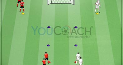 4つのマーカーを使い、およそ15 x10 mの大きさで台形型のグリッドを作成。その一片にゴールを設置。また、その中に小さなグリッドを作成。 それぞれのマーカーに、同じチームのプレーヤーが2人ずつ入る。同じチーム同士で向かい合うように位置を取る。ページ