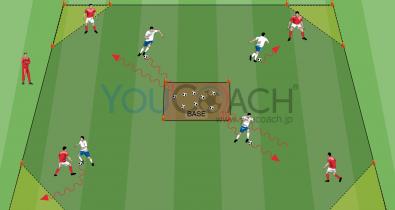 これは、ディフェンス陣に理想的なポジショニングを取らせる時間を与えないことで、トップスピードで攻撃を行う事の概念を理解させるためのメニューである。ディフェンダーは、より早くポジショニングを取りオフェンス陣の攻撃を阻む。パススピード、オフェンスのプレイヤーのマークを外す動き、そして展開局面のインテンシティの高さは、ディフェンダーの混乱を引き出し、利用することを目的としている(...技術