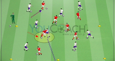ルックアップのボールドリブルは、ピッチ全体、敵・味方のポジションを視野に入れる事が出来ます。ここでは楽しさと競争心の要素を加えてボールドリブルを学びましょう。戦術