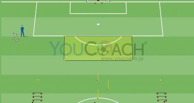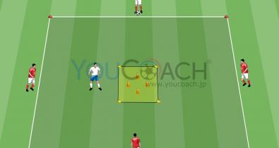 マーカーを用いて30×30mの四角形を作成する。四角形の中の、対角となる2つの隅にそれぞれ3×3m四角形を作成する。それぞれの小さい四角形の中に、各チーム1人ずつプレイヤーを立たせる。その2人のプレイヤー(図中では赤と白のプレイヤー)はボールポゼッション中その四角形の中から出ることが出来ない。大きい四角形の中に、赤と白のチームに分けたプレイヤーをそれぞれ4人ずつ配置する(図中では、...ページ