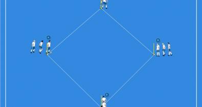 ポール4本を使用して距離が10メートルになるようにひし形を作る。プレイヤーを3人1組4グループ(A,B,C,D)へ分けて、どのグループもポールの横に配置する。Aグループの最初のプレイヤーがボールを持ってスタート。技術