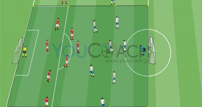 相手ディフェンスの隙をつくサイドの有効活用法です。このトレーニングを通じて3-5-2フォーメーションの両サイドの動きをチェックできます。ページ