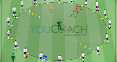 半径20mのサークルを図のように作ります。1つのステーションに対して、プレーするのは1名(自己受容覚系メニュー)なので、ステーションの種類は多岐に渡ります。スラロームのコーンの間隔は50cm、ハードルの間隔は70cmで統一しましょう。全プレーヤー空いているマーカーにスタンバイしたら準備完了。フィジカル