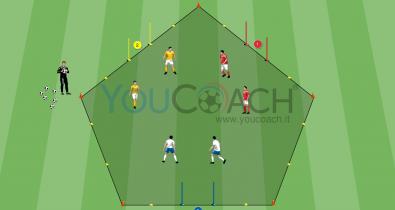 横幅25m×縦幅35のフィールドをマーカーで作る。短い方の両辺に1つずつゴールを置く。ビブスを用いて22人のプレイヤーを、それぞれフィールドプレイヤー10人ずつの2チームに分ける(図中では、赤チーム対白チームに分かれている)。フィールドの中で5対5を行う。残りのプレイヤーは、相手チームの長い方の両辺上の相手ゴールの1番近くに、それぞれプレイヤーがふたりずつ居るように、且つ、...戦術
