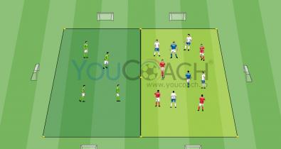 マーカーを用いて、20×20mのプレーエリアを作る。12人のプレイヤーを4人3組に分け、プレーエリアの中に配置する(図中では、赤と緑と白のチームに分かれている)。プレイヤーは四角形の中に散りじりになる。適当に選んだ4人のプレイヤーにそれぞれ1つずつボールを与える。技術