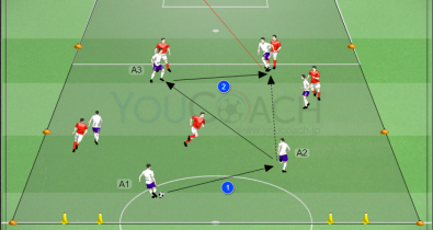 プレイヤーたちは、このトレーニングを通して、実際のゲームで使える攻撃のアイディアを学ぶことが出来ます。目的は、守備網にギャップを作ること、中央ゾーンでの攻撃。戦術