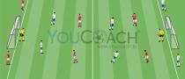 - 下記の図のような4対4+フリーマン1名の状況に切り替える。この場合、プレーエリアのサイズを35x15mに変更しましょう。5回連続パス成功でターゲットに楔のパスを入れてから最後はシュート。