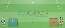 トレーニングに必要な広さは、60×40メートル。フィールドの左サイド、ゴールから25メートルの地点に2つのコーンを使い5メートル幅のゲートを1つ作る。4人1組で3グループにチーム分けをする。1つ目のグループは、ゲートの10メートル手前の位置にそれぞれボールを持って集まる。2つ目のグループは、ゲート反対側のペナルティエリア付近でゴールに肩を向けて立つ(図に示されたように)。3つ目のグループは、(図のように)ゴールの側面にビブスを着て立つ。ゴールキーパーは、ゴールを守る。