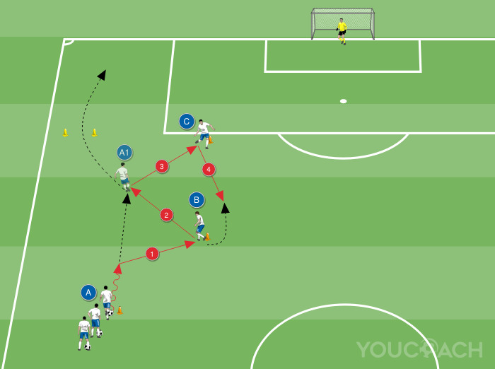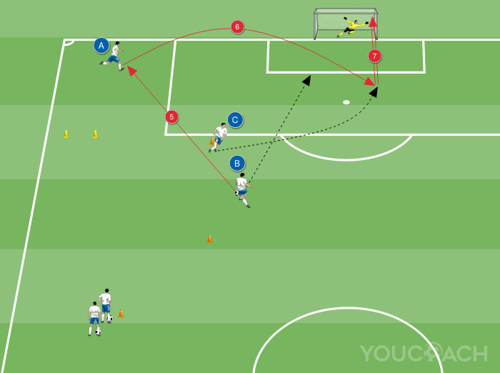 - Recebido o passe, o jogador A terá que controlar a bola e cruzar para o centro da área de grande penalidade para a inserção de B e C que tentarão rematar à baliza