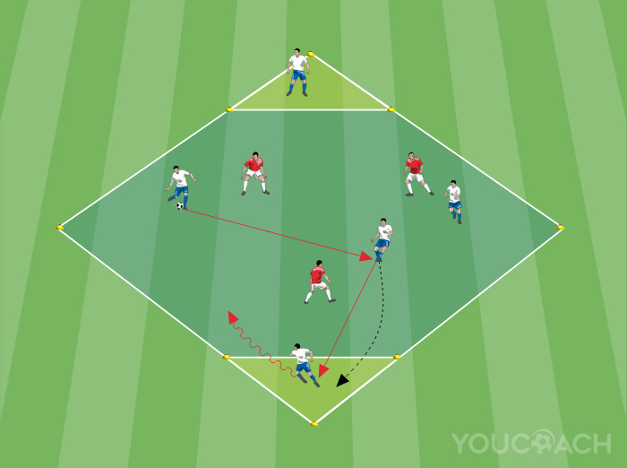 Área de jogo em forma de diamante para posse de bola 5 contra 3 com busca de amplitude e profundidade |