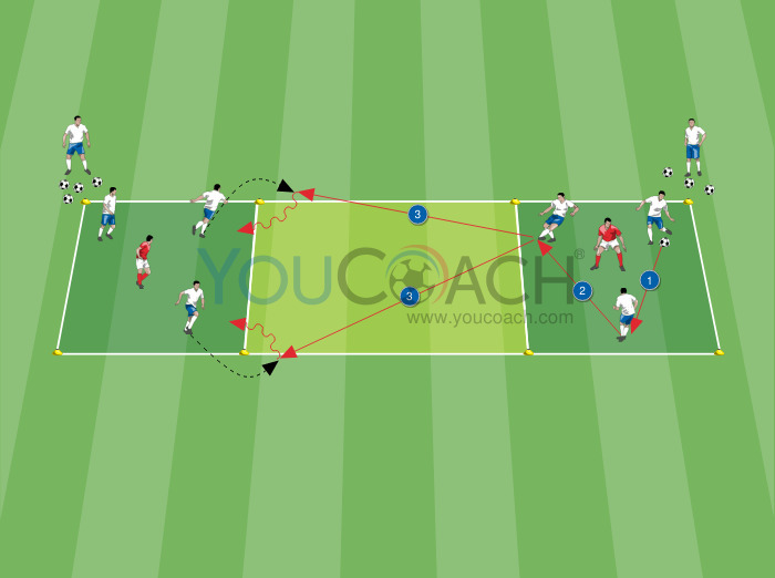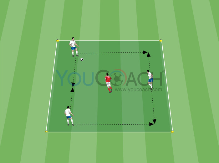 O segundo 3 vs 1 é mais complicado, porque os jogadores com a posse de bola (quatro defensores e dois meio-campistas brancos) trabalham juntos interagindo dos dois retângulos.