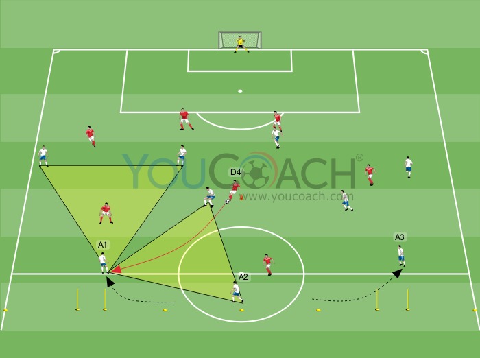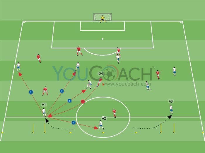 - O jogo começa a partir do cone: o jogador D4 finge perder a bola mesmo no meio-campo, com um passe para um dos jogadores brancos (A1). Uma situação de transição da defesa para o ataque é definida. A equipa que ataca deve posicionar os seus jogadores bem abertos rapidamente para procurar alguma profundidade