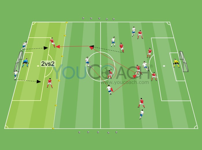 - Durante o decorrer do 2 contra 2, a equipa branca deve recuperar rapidamente nas laterais uma nova bola e voltar a atacar a baliza defendida pela equipa vermelha. Pode acontecer que na segunda interceção da equipa vermelha, o 2 contra 2 na zona amarela ainda não tenha terminado. Neste caso, os jogadores vermelhos terão de ser bons a atrasar a ação e a manter a posse de bola até que se possa fazer um novo jogo para os seus colegas de equipa atacantes prontos para receber na "zona de finalização"