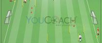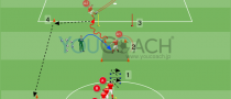 オフェンス1名、ディフェンス2名、GK1名の状況下で、オフェンスの素早いフィニッシュと、ディフェンス側の素早いリスタートを鍛えるトレーニングメニュー |