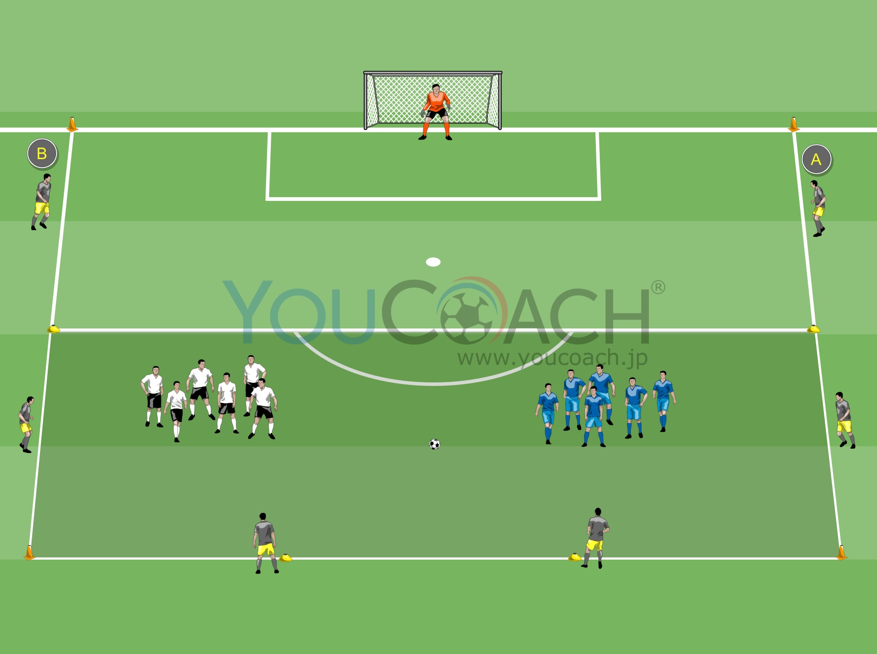 オーバーラップ - サイドからのオーバーラップとサイド奥深くからのクロスを反復するスモールサイドゲーム |